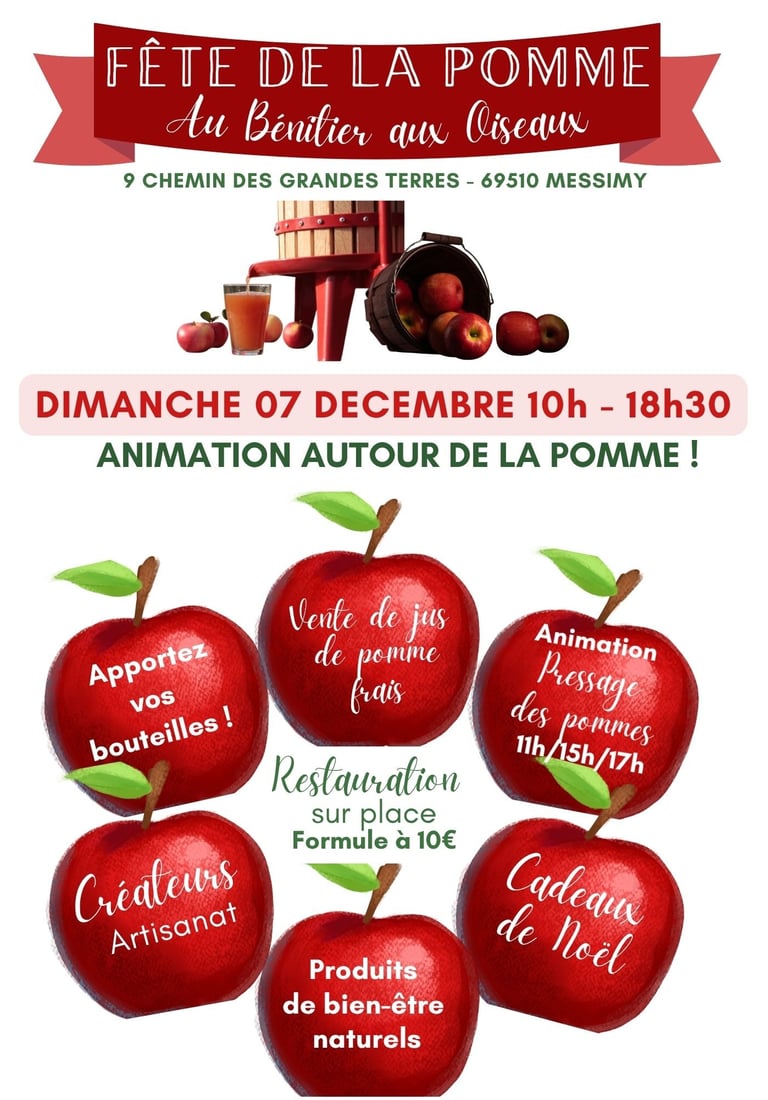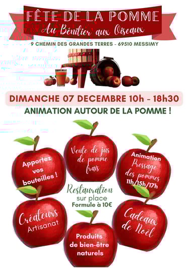 Marché de Noël et fête de la pomme à Messimy, ferme "Au bénitier aux oiseaux", dimanche 7 décembre 2025, 10h-18h30